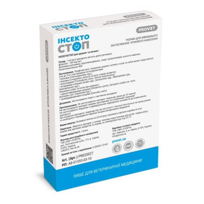 Краплі на холку ProVET «Інсектостоп» для кошенят та цуценят до 3 кг, 6 піпеток по 0,5 мл (від зовнішніх паразитів)