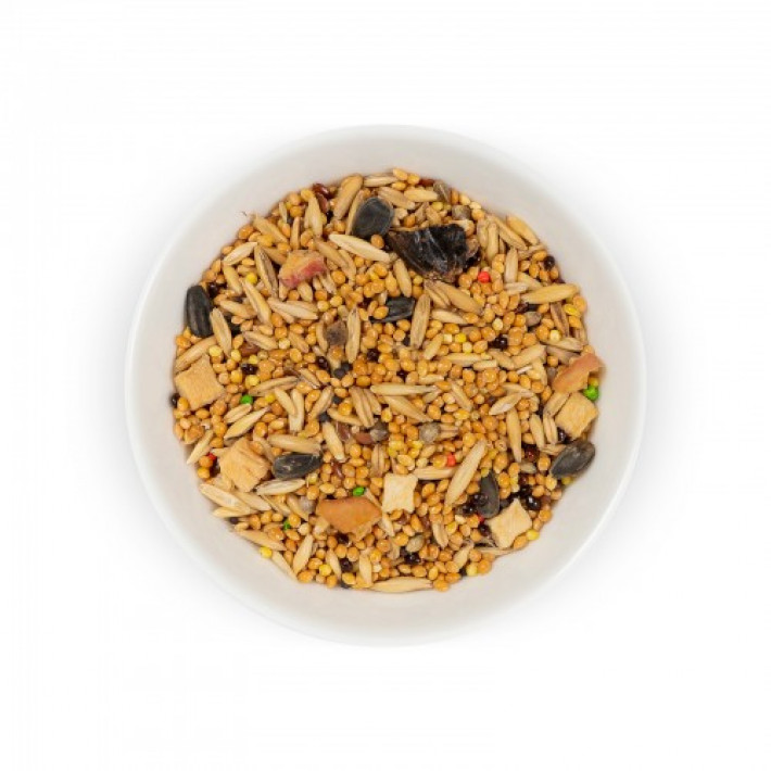 Склад: насіння льону, ріпак, канаркове насіння, насіння конопель, насіння соняшнику, сушене яблуко, виноград сушений, просо чорне, кероб подрібнений, просо жовте, просо червоне, пшоно, овес, овес голозерний.