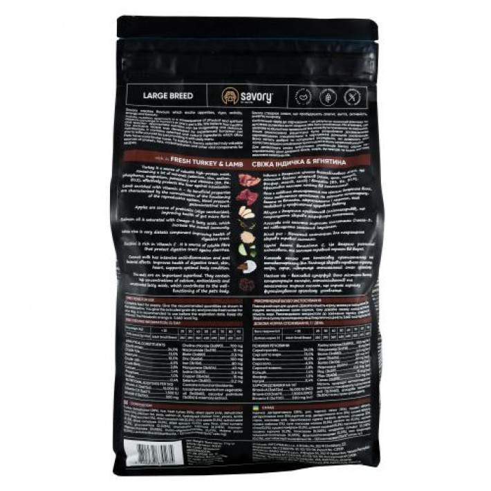 Сухий корм для собак великих порід Savory містить якісне м’ясо індички та ягняти, суперфуди, помідори, сочевицю і цукіні. Ці компоненти створені природою для оптимальної кондиції, міцних м’язів і здорових суглобів у чотирилапих велетнів.
