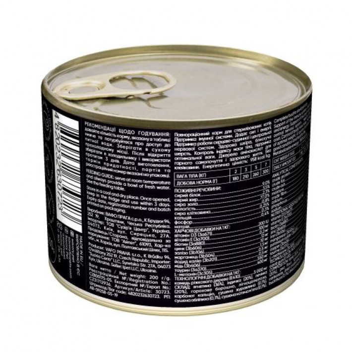 Харчові добавки на 1 кг: вітамін D3 (3а671) 200 МО, вітамін Е (3а700) 100 мг, біотин (3а880) 0,2 мг, цинк (3b606) 12 мг, залізо (3b106) 10 мг, марганець (3b504) 1,5 мг, йод (3b201) 0,5 мг, мідь (3b406) 0,5 мг, таурин (3а370) 550 мг, L-метіонін (3с305) 400 мг, кальцій (Ca) 0,25%, фосфор (P) 0,3%, натрій (Na) 0,4%.