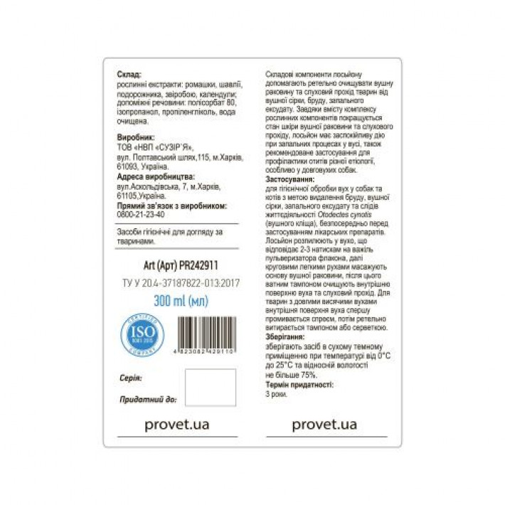 Складові компоненти лосьйону допомагають ретельно очищувати вушну раковину та слуховий прохід тварин від вушної сірки, бруду, запального ексудату. Завдяки вмісту комплексу рослинних компонентів покращується стан шкіри вушної раковини та слухового прохіду, лосьйон має заспокійливу дію при запальних процесах у вусі, також рекомендоване застосування для профілактики отитів різної етіології, особливо у довговухих собак.
