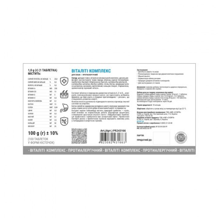 Вітаміни Provet Profiline для собак, Віталіті Комплекс протиалергічний, 100 таб.