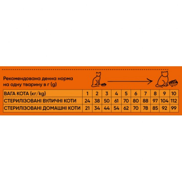 | Вуличні коти (г) | 24 | 38 | 50 | 61 | 70 | 80 | 88 | 97 | 104 | 112 |