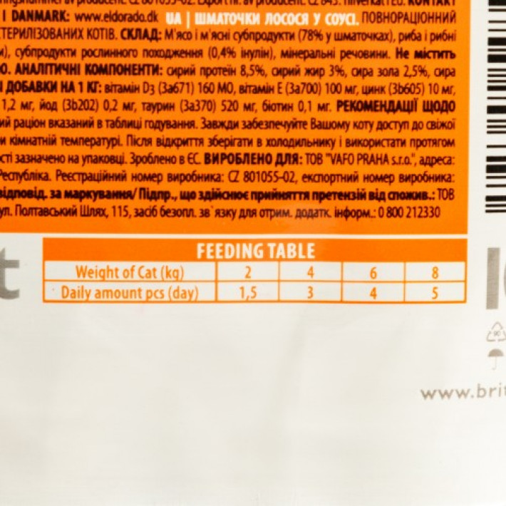 Brit Premium Cat Pouch шматочки лосося у соусі – це повнораціонний вологий корм преміумкласу, створений спеціально для задоволення усіх харчових потреб стерилізованих котів. Цей продукт відмінно враховує природні уподобання стерилізованих улюбленців та відповідає їхнім спеціальним харчовим потребам.