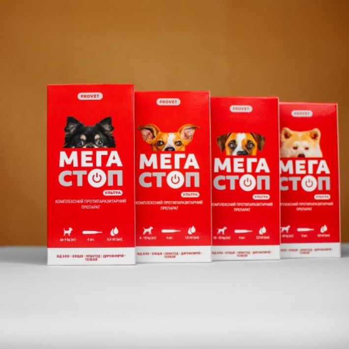Краплі PROVET Мегастоп Ультра для собак до 4 кг, 4 піпетки по 0,4 мл (інсектоакарицид, антигельмінтик)