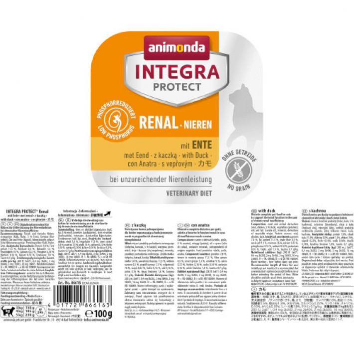 INTEGRA PROTECT Renal з качкою – спеціальний дієтичний корм суперпреміум класу для котів із захворюваннями нирок. Цей раціон містить значно менше фосфору і білка в порівнянні зі звичайним кормом