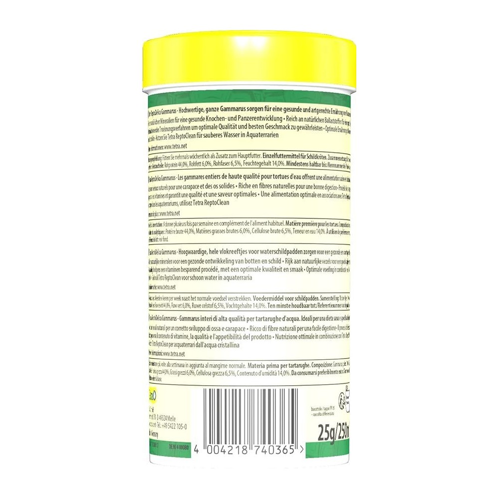 Цей натуральний корм для рептилій виготовлений у Німеччині та містить добірний гамарус, який є природним джерелом білка та мінералів. Сухий корм для черепах у зручній банці об'ємом 250 мл дозволяє легко дозувати порції та зберігати свіжість продукту протягом тривалого часу. Регулярне харчування для черепах з використанням продукції Tetra сприяє зміцненню панцира та підтримці імунітету.