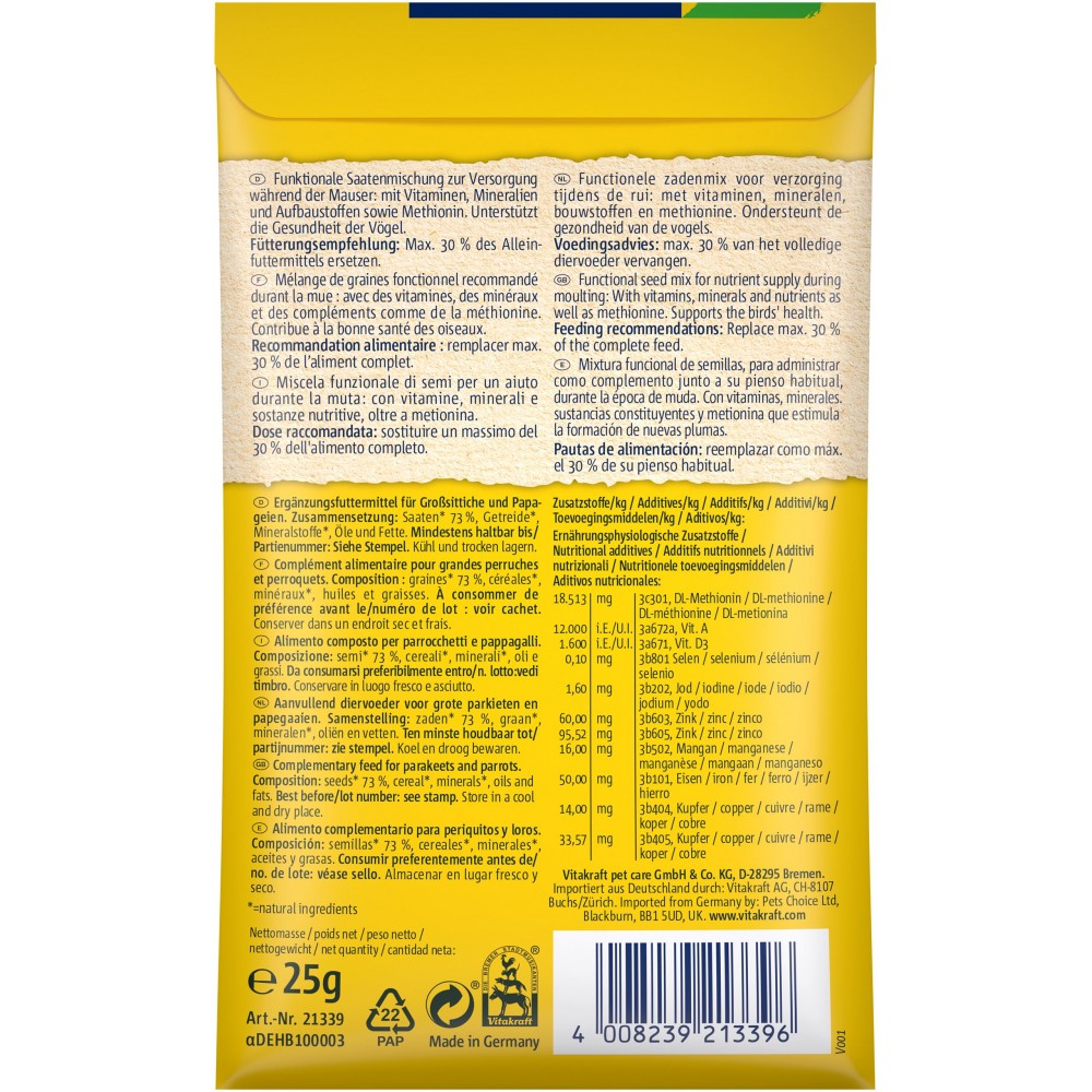 Вітамінізована добавка Vitakraft Mauserhilfe — це спеціалізований засіб, розроблений для підтримки здоров'я великих та середніх папуг у складний період линьки у папуг. Ця унікальна зернова суміш від відомого німецького бренду забезпечує організм пернатого улюбленця необхідними мікроелементами для швидкого та здорового формування нового оперення.