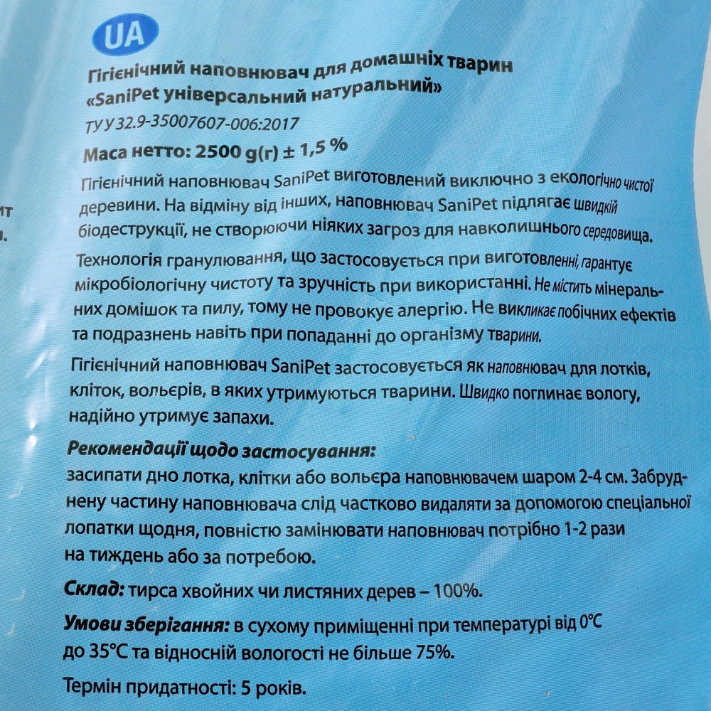 Наповнювач Природа Sani Pet Універсальний деревний для котів 2,5 кг