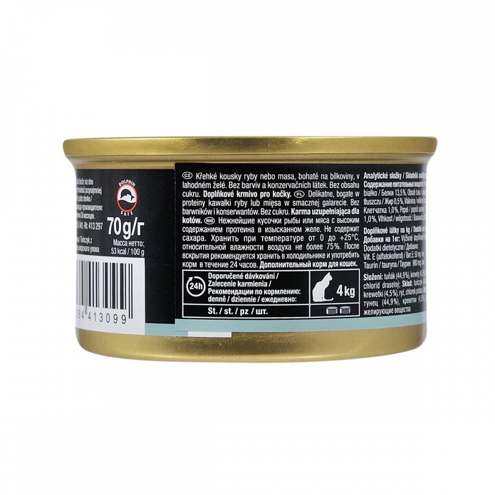 Цей вологий корм для котів належить до кормів супер преміум класу, що гарантує високу поживну цінність та відсутність шкідливих добавок. Ніжні кусочки в желе з добірним тунцем та креветками обов'язково сподобаються вашому вихованцю.