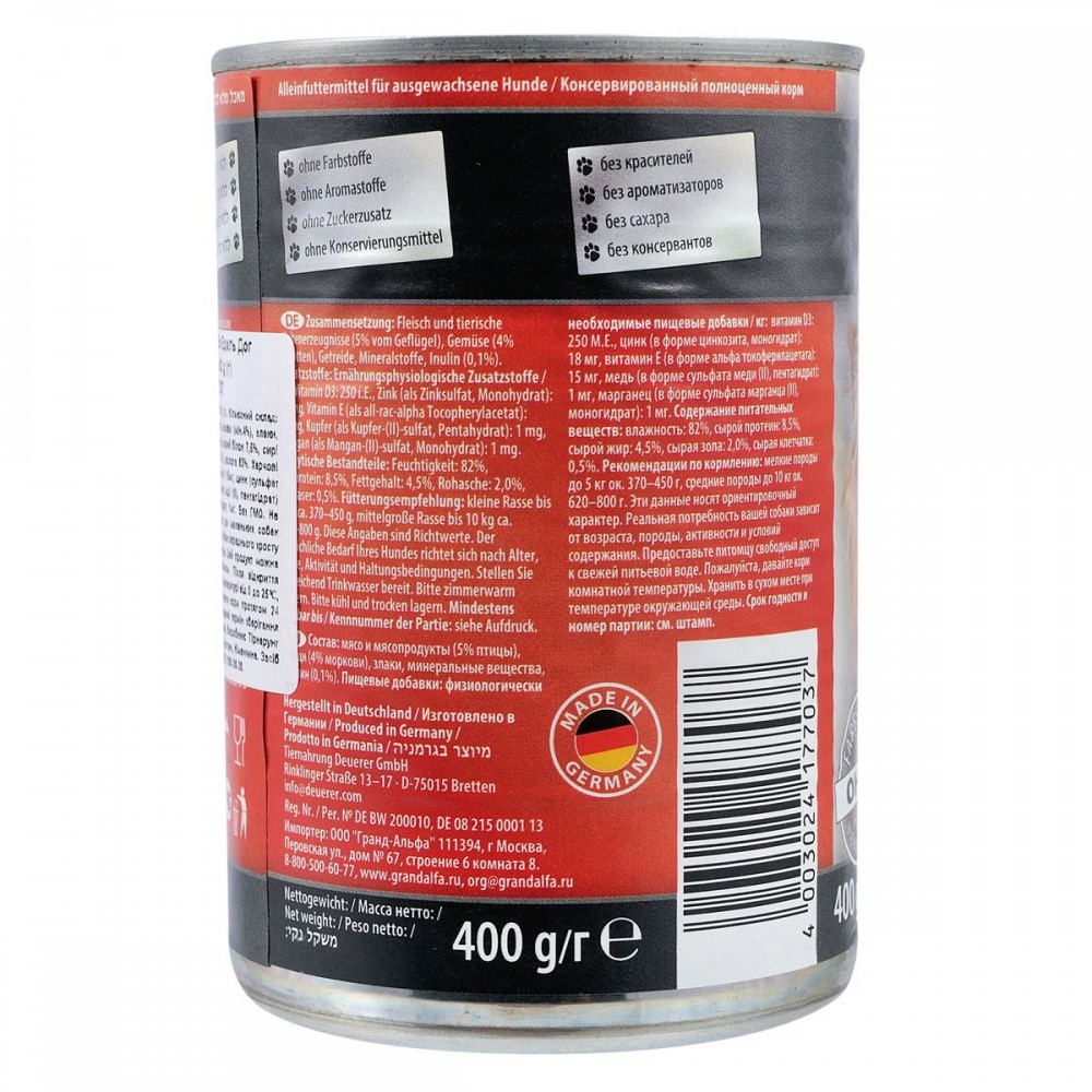- Зручна упаковка: консерва вагою 400 г ідеально підходить для порційного годування дорослих собак.