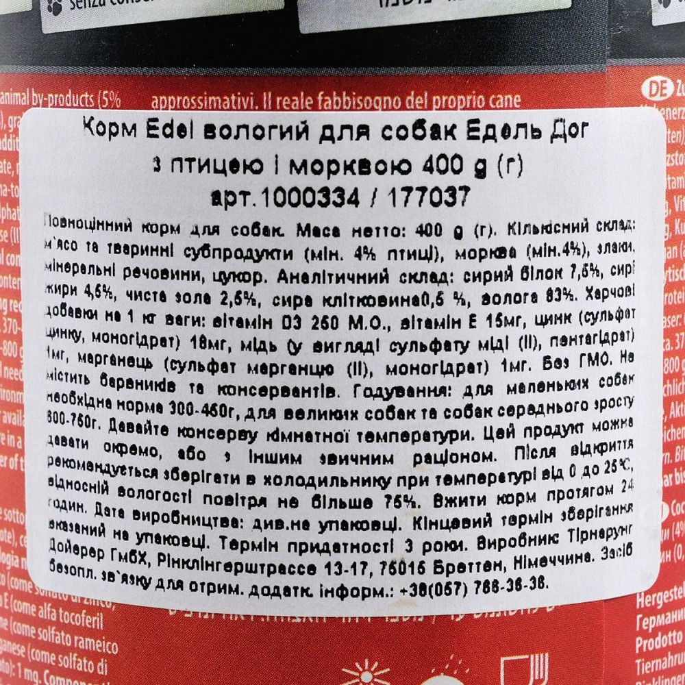 Вологий корм Edel Cat для собак з птицею і морквою — це збалансований раціон преміум-класу, створений для задоволення потреб вашого улюбленця. В асортименті інтернет-магазину Paddington ви знайдете лише найкращі товари для домашніх улюбленців, і цей продукт є чудовим вибором для щоденного харчування.