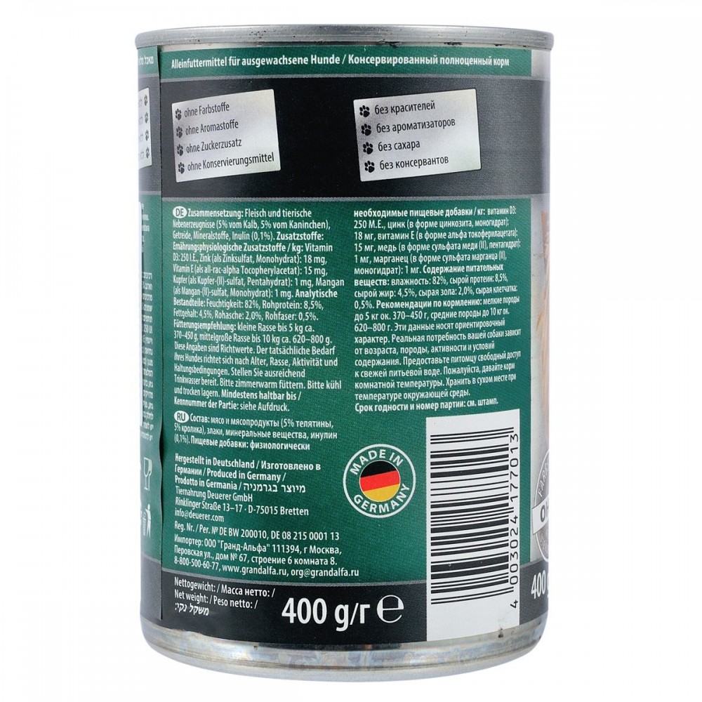 - Зручна консерва для собак з кроликом вагою 400 г.
