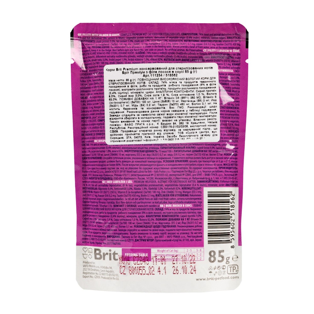 Вологий корм Brit Premium Cat Sterilised Salmon Fillets in Gravy для стерилізованих котів, 85 г