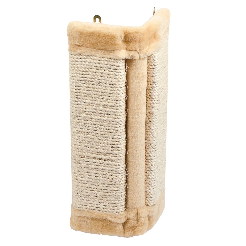 Ця кутова дряпка спеціально розроблена для кріплення на кути стін, що дозволяє ефективно використовувати простір. Виготовлена з натурального сизалю, вона забезпечує довговічність та стійкість до активного використання. Захист меблів від кігтів стає простим завданням, адже кішка отримує зручне місце для щоденного догляду за кігтями.
