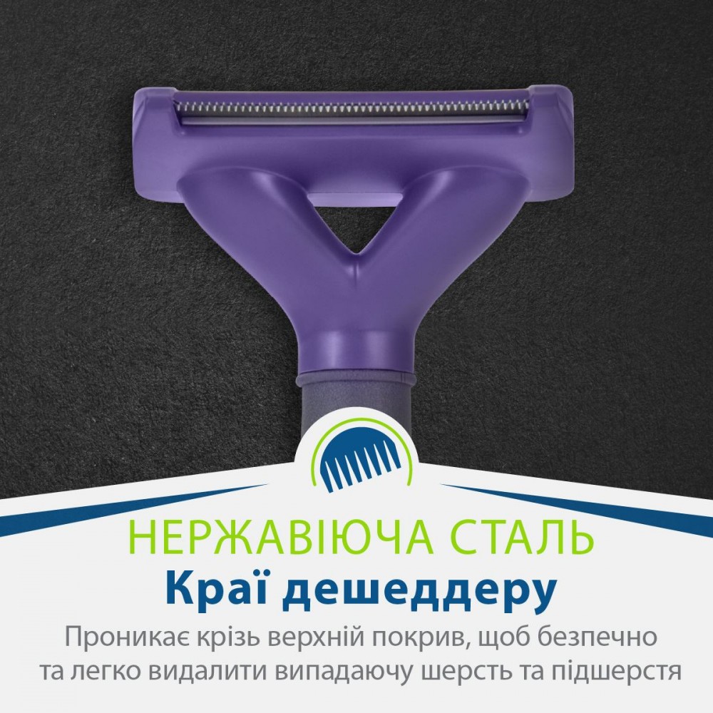 Цей дешеддер для котів спеціально адаптований для тварин із коротким типом шерсті. Його унікальна конструкція дозволяє безпечно та швидко проводити видалення підшерстя, не пошкоджуючи остьовий волос. Регулярне використання інструменту значно зменшує кількість випаділої шерсті на меблях та одязі.