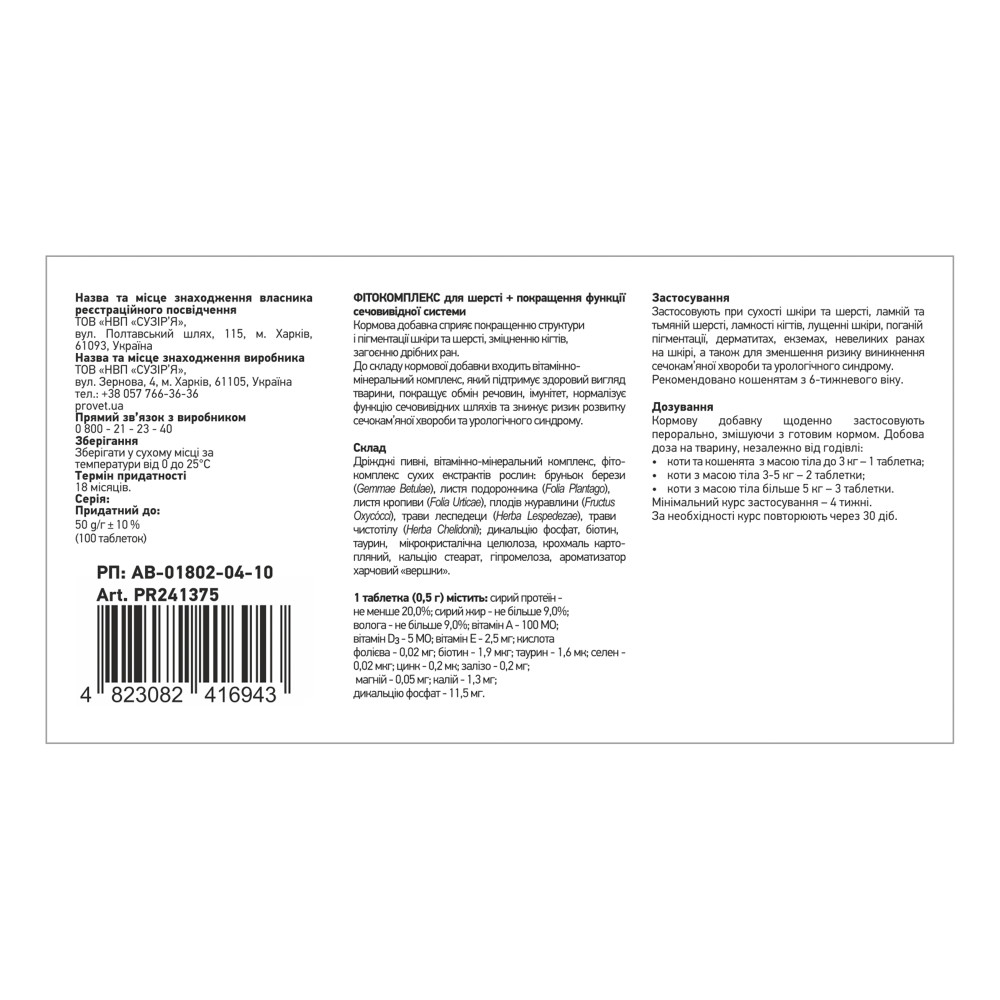 Фітокомплекс Provet ФІТОВИТ для котів для шерсті та сечовивідної системи