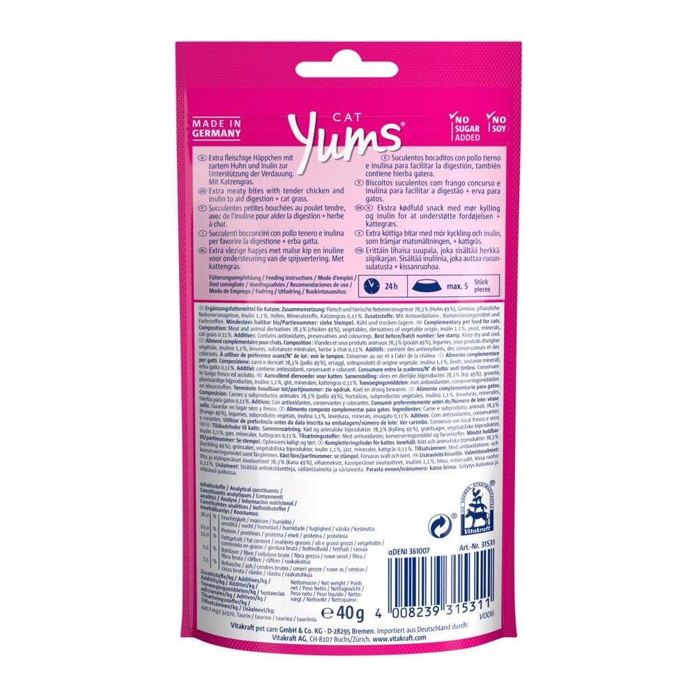 Ці смаколики для котів розроблені спеціально для підтримки гігієни ротової порожнини. Завдяки особливій текстурі, ці подушечки сприяють ефективному догляду за зубами кота, допомагаючи видаляти наліт під час жування. Vitakraft Yums виготовлені в Німеччині за найвищими стандартами якості.