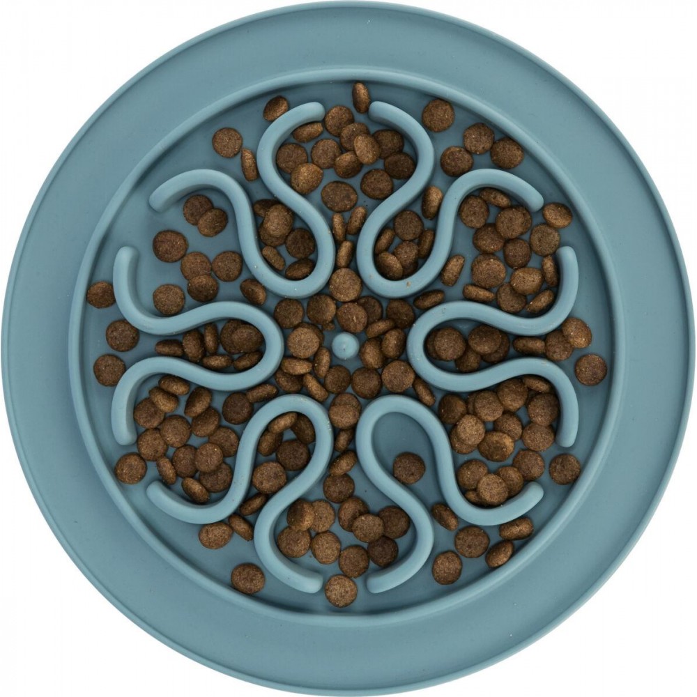 - Спеціальна конструкція: миска для повільного годування змушує тварину витрачати більше часу на трапезу, що знижує ризик здуття живота та переїдання.