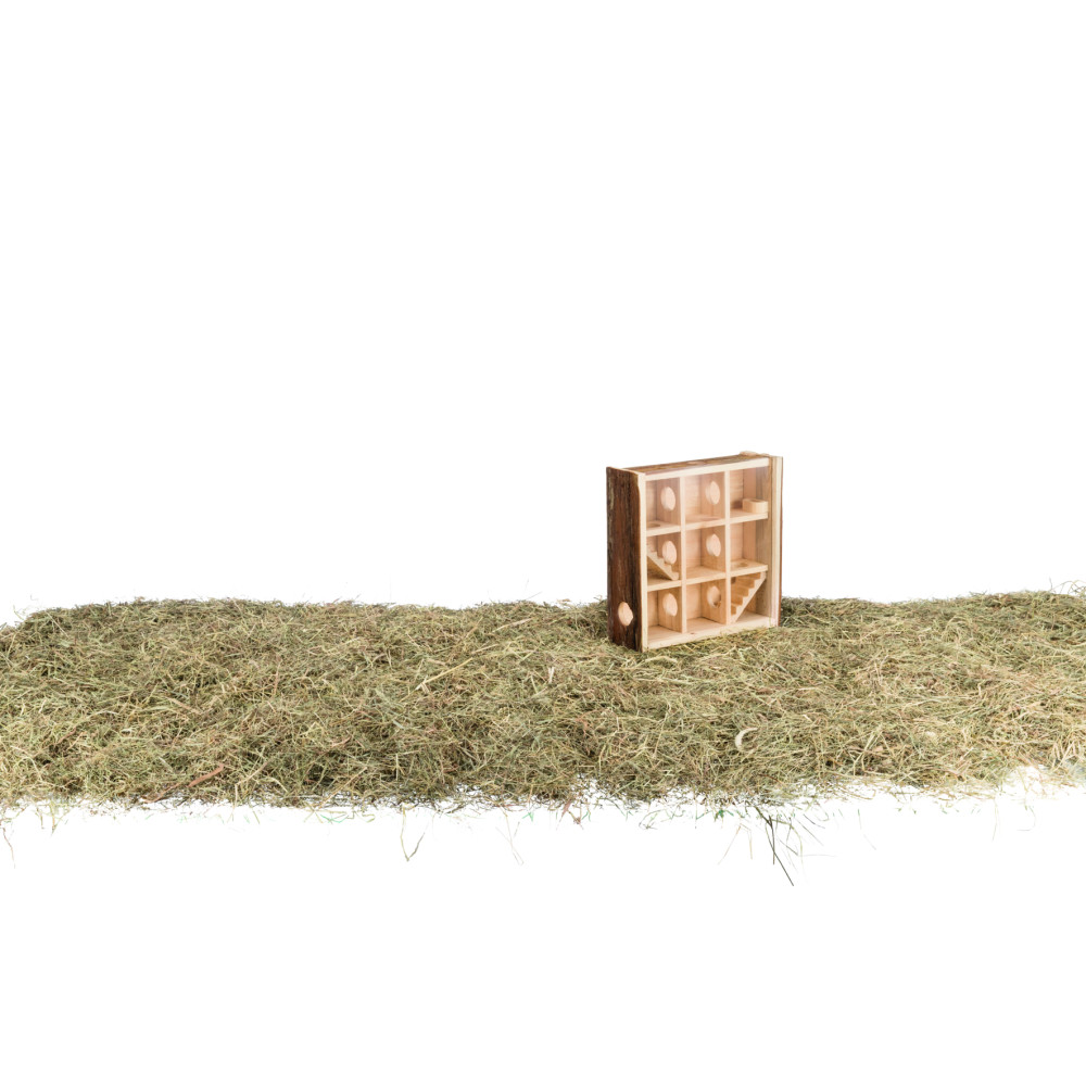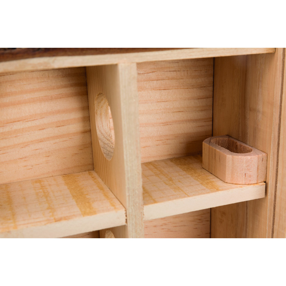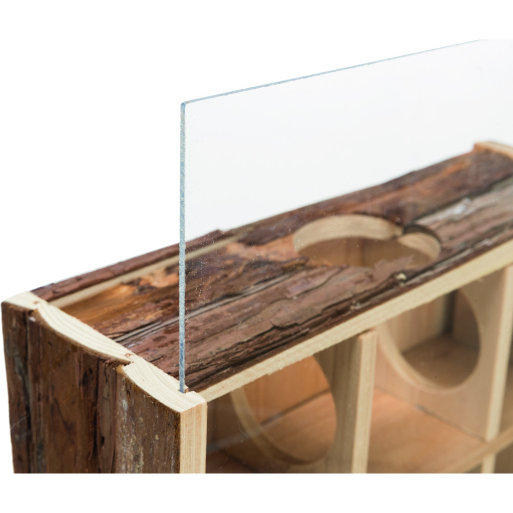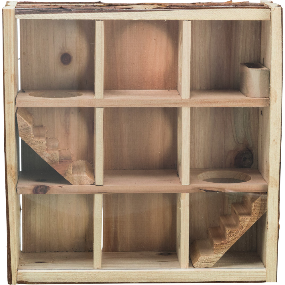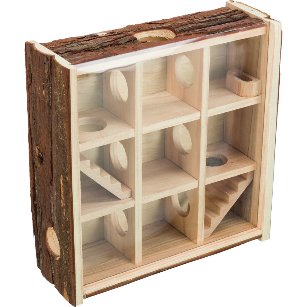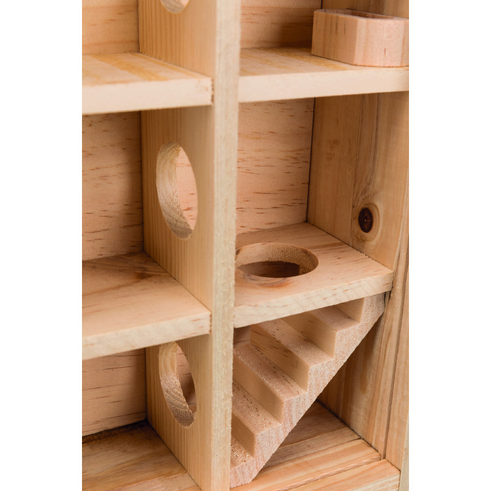 Цей будиночок для хом'яка виготовлений з натурального дерева, що робить його безпечним для гризіння та екологічним. Завдяки продуманій конструкції з 9 окремими кімнатами, ваш вихованець зможе досліджувати нові простори, ховатися та облаштовувати своє гніздо.