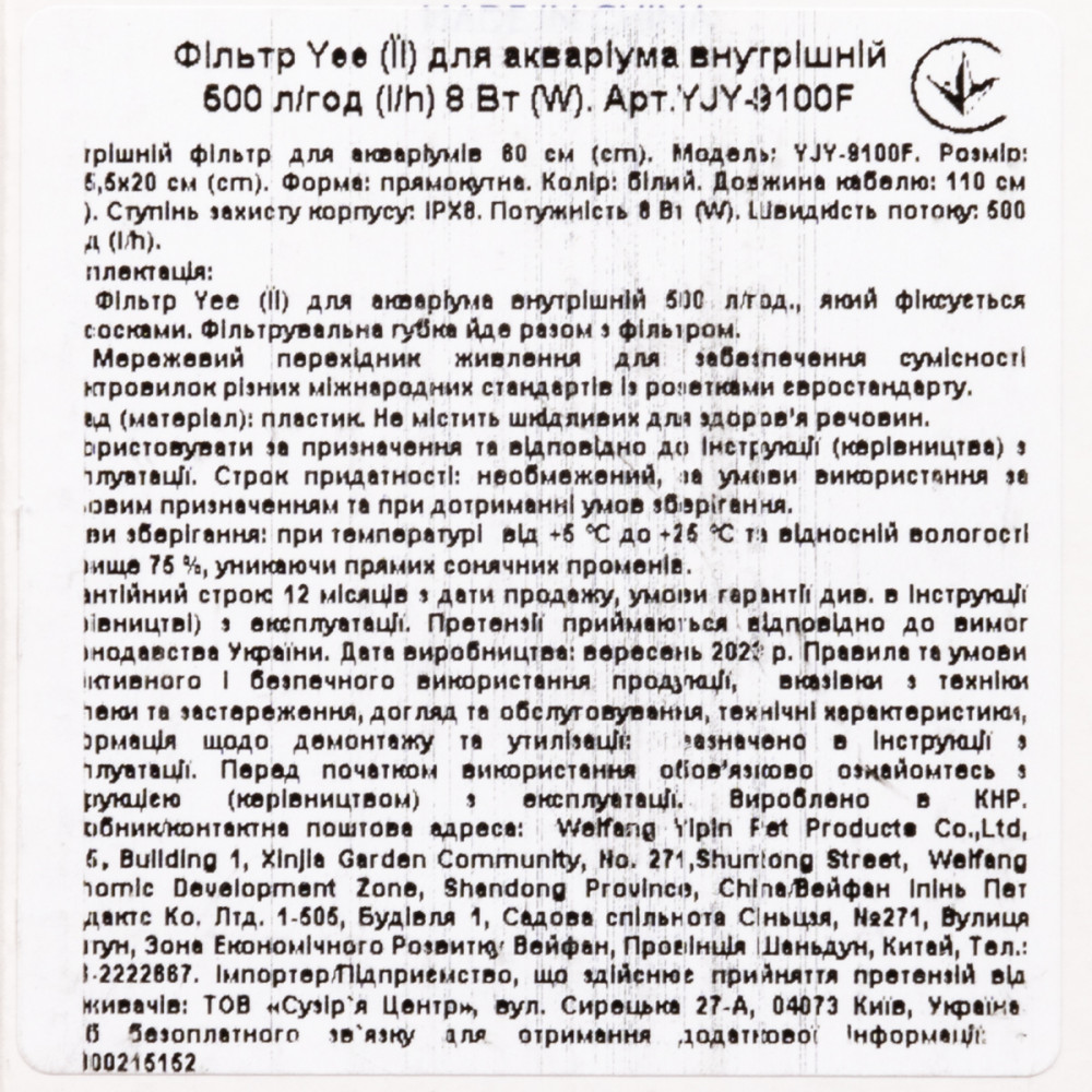 Внутрішній фільтр для акваріума Yee 500 л/год 8 Вт