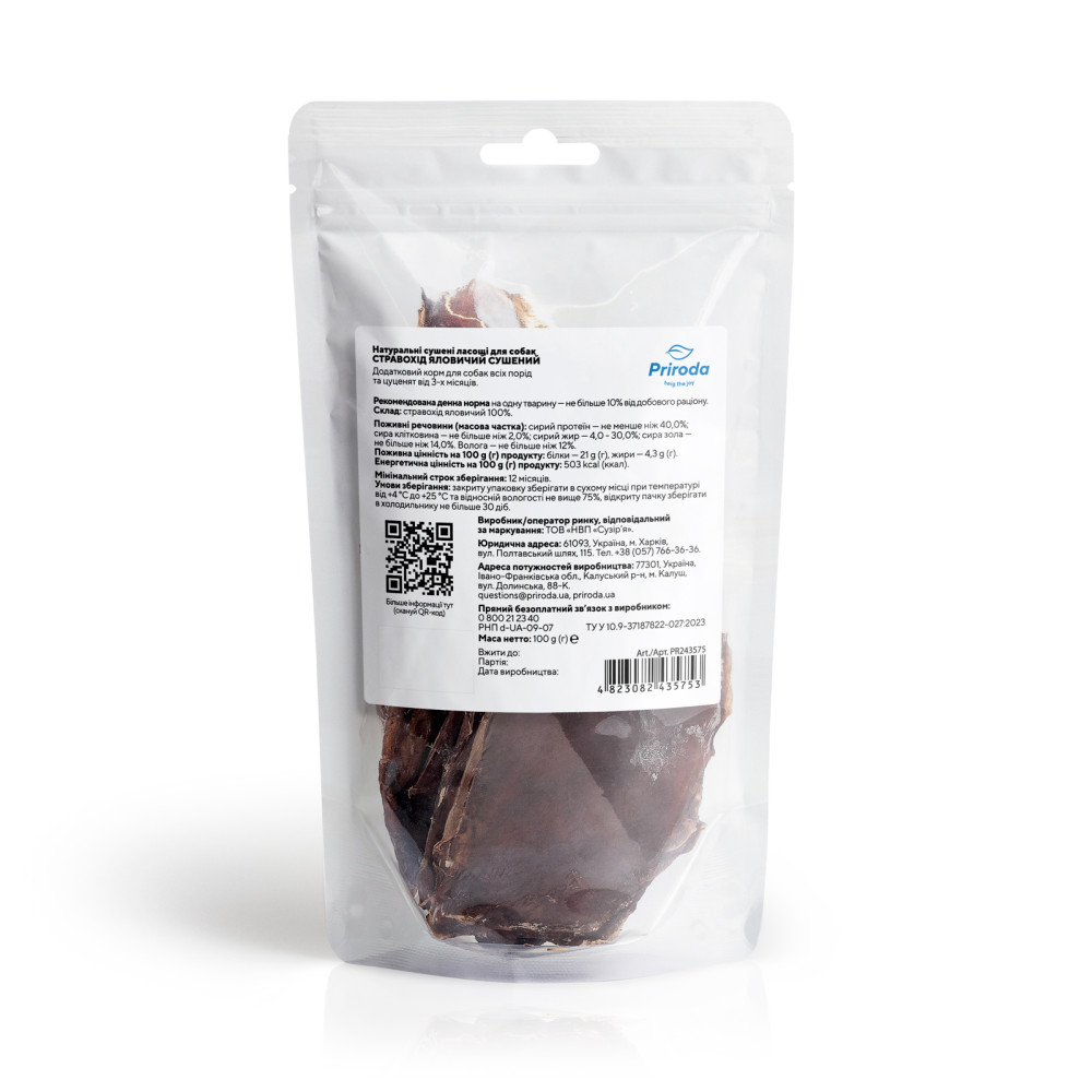 Натуральні сушені ласощі для собак Стравохід яловичий сушений 100 г від відомого бренду Природа — це ідеальний вибір для власників, які піклуються про здоров'я свого чотирилапого друга. В асортименті інтернет-магазину Paddington ці натуральні ласощі для собак займають особливе місце завдяки своїй високій якості та природному складу.
