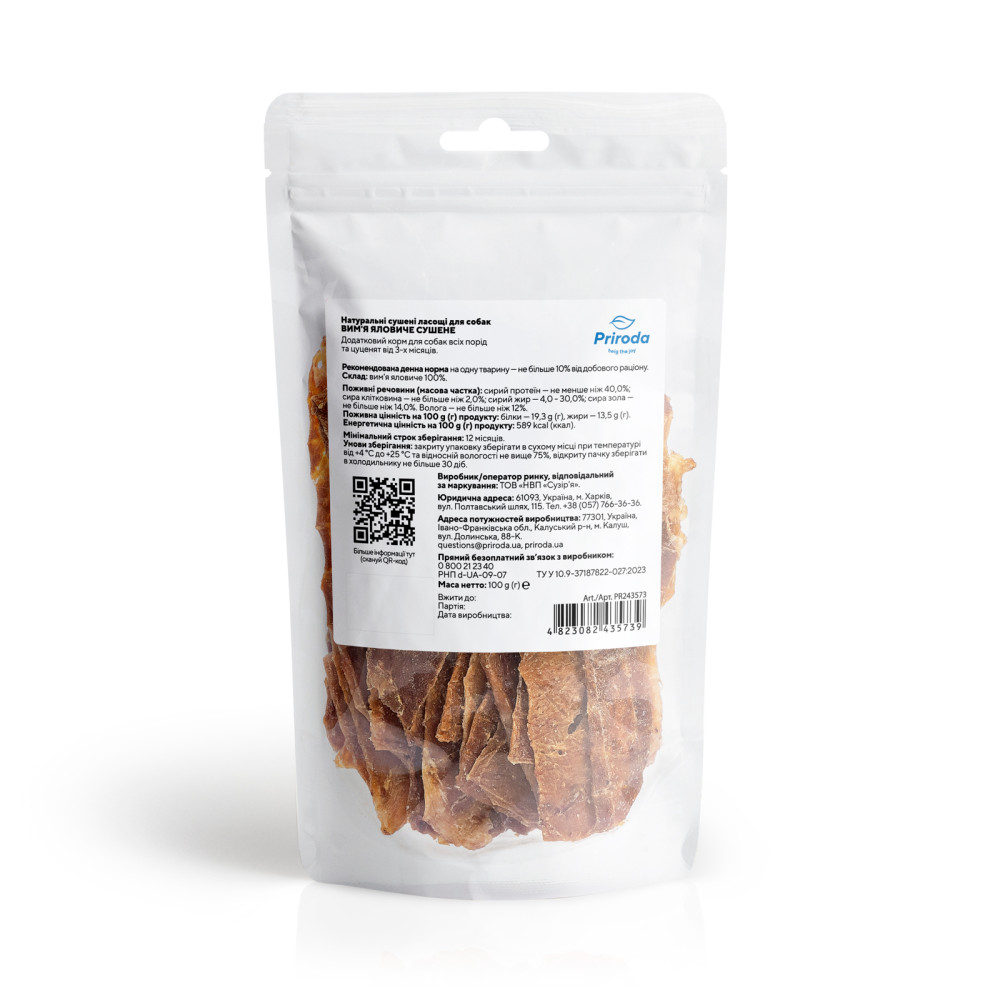 Натуральні сушені ласощі для собак Вим’я яловиче сушене 100 г від відомого українського бренду Природа — це ідеальний вибір для дбайливих власників, які прагнуть порадувати свого улюбленця корисним та смачним частуванням. В асортименті інтернет-магазину Paddington ці ласощі займають особливе місце завдяки своїй високій якості та натуральному складу.
