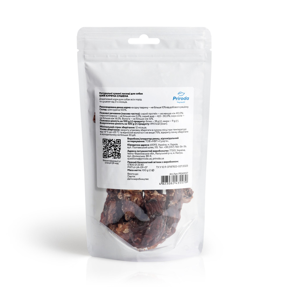 Натуральні сушені ласощі для собак Шия куряча сушена 100 г від українського бренду Природа — це ідеальний вибір для дбайливих власників, які шукають корисні та смачні натуральні ласощі для собак. Ці ласощі виготовлені з добірної сировини, що зберігає всі корисні властивості продукту.
