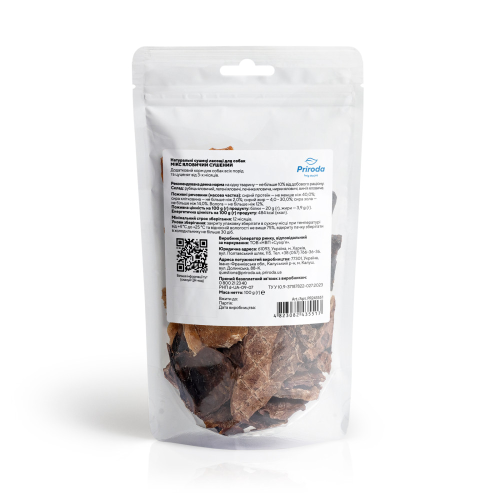 Натуральні сушені ласощі для собак Мікс яловичий сушений 100 г від відомого бренду Природа — це ідеальний вибір для дбайливих власників, які шукають корисне та смачне заохочення для свого улюбленця. В асортименті інтернет-магазину Paddington ці ласощі займають особливе місце завдяки своїй якості та натуральному складу.