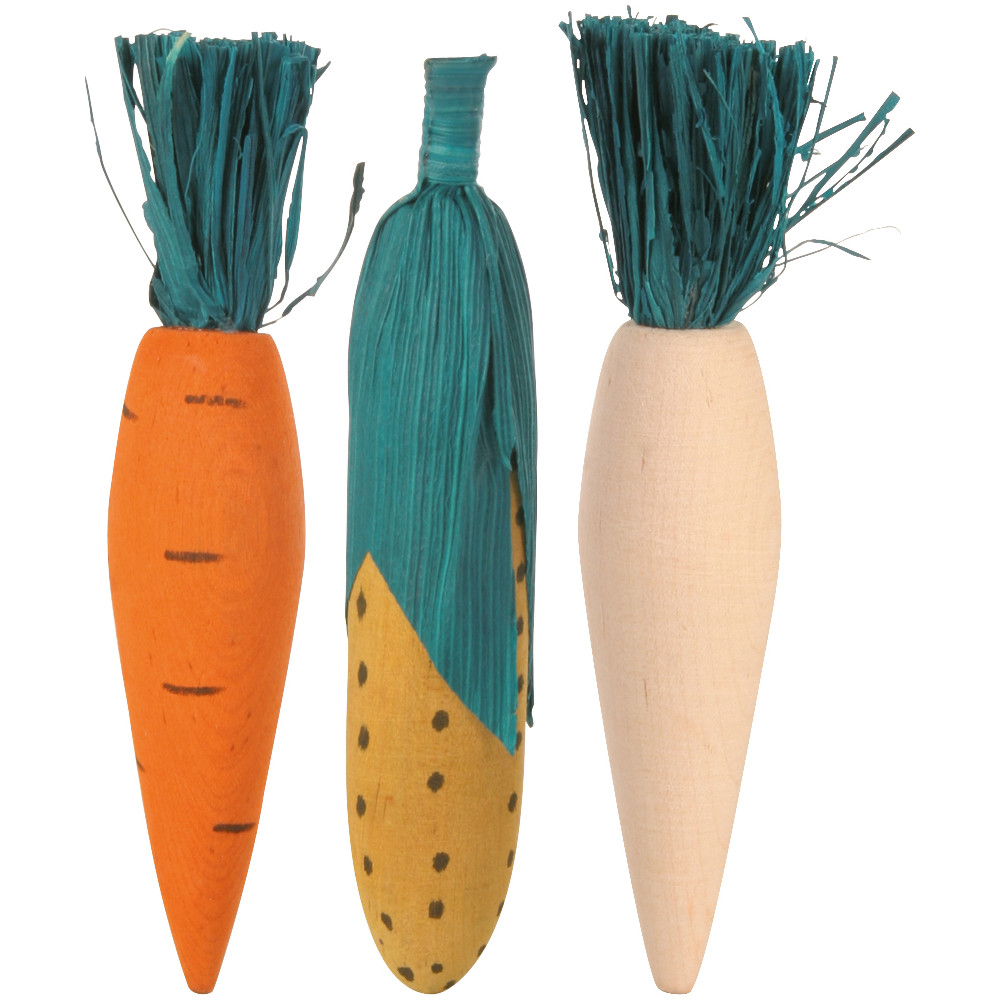 Ці іграшки для гризунів виготовлені з натуральної соломи, що робить їх безпечними для гризіння. Вони допомагають сточувати зуби, що є критично важливим для здоров'я гризунів. У наборі представлено 3 штучні овочі розміром 10 см, які виглядають дуже привабливо та стимулюють природну цікавість тварини.