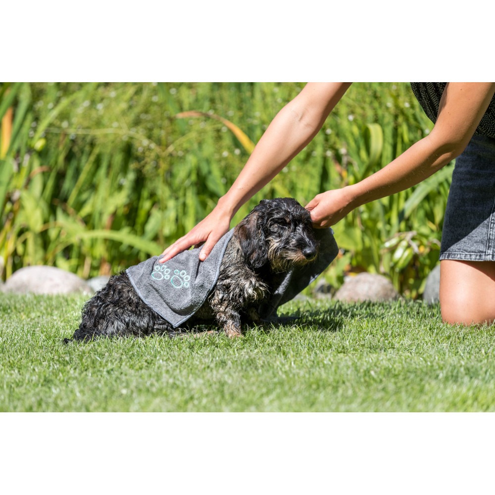 Цей рушник для собак виготовлений з високоякісного поліестеру, що гарантує швидке поглинання вологи та довговічність виробу. Завдяки компактному розміру 50x60 см, він ідеально підходить для представників малих порід вагою до 10 кг. Двостороння модель дозволяє використовувати рушник довше, а стильний сірий колір гармонійно впишеться в інтер'єр вашого дому.