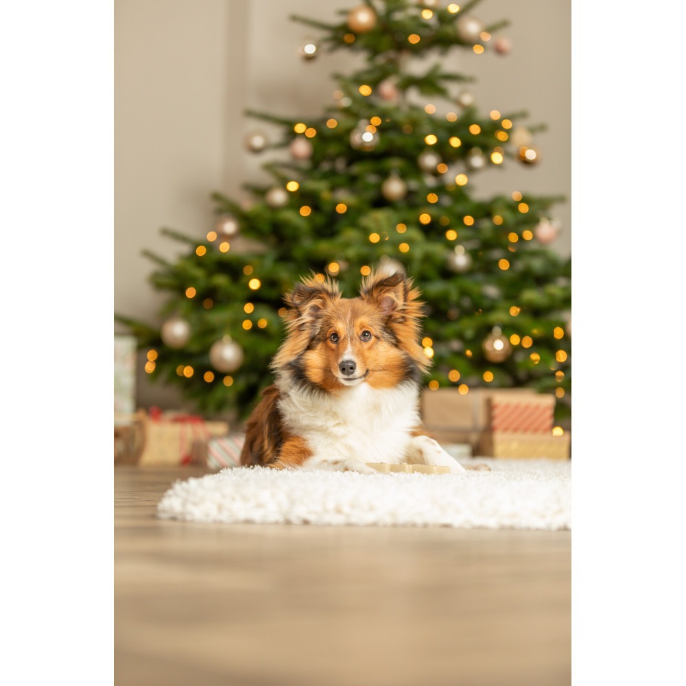 - Дизайн: яскрава різдвяна ялинка, що привертає увагу собаки.