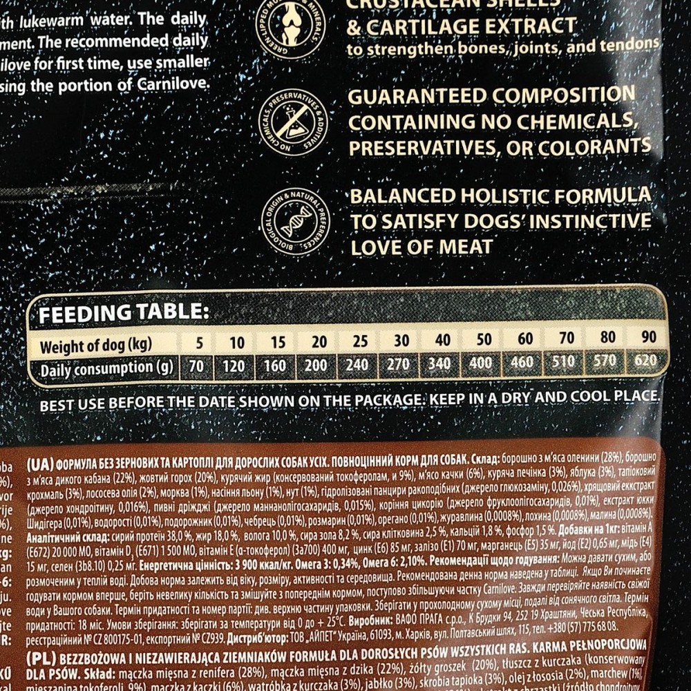 Склад: борошно з м’яса оленини (28%), борошно з м’яса дикого кабана (22%), жовтий горох, курячий жир, м‘ясо качки, куряча печінка, яблука, тапіоковий крохмаль, лососева олія, морква, насіння льону, нут, гідролізовані панцири ракоподібних, хрящовий екстракт, пивні дріжджі, коріння цикорію, екстракт юкки Шидігера, водорості, подорожник, чебрець, розмарин, орегано, журавлина, лохина, малина. Це повноцінне харчування для собак з олениною, що відповідає найвищим стандартам якості.