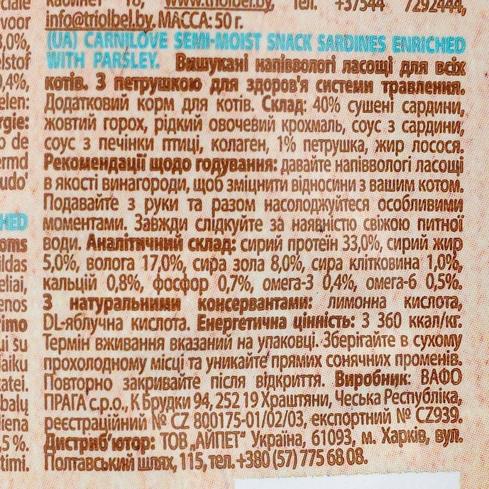 Ці смаколики для котів мають збалансовану рецептуру, що сприяє здоров'ю травної системи. Завдяки високому вмісту сардини та додаванню петрушки, вони не лише корисні, а й надзвичайно привабливі на смак.