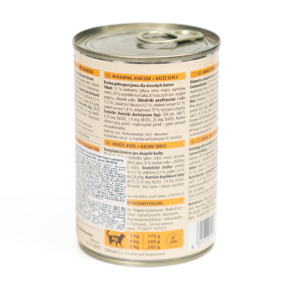 Animonda Carny Adult Beef, Chicken + Duck Hearts – це високоякісний вологий корм для котів, який обожнюють домашні улюбленці! Він виготовлений виключно зі свіжих м'ясних інгредієнтів. Секрет успіху цього раціону полягає в ідеальному поєднанні яловичини та курячої печінки з соковитими качиними серцями. Кілька видів м'яса забезпечують кота денною порцією високоякісного білка. Цей повнораціонний корм супер преміум класу ідеально підходить для дорослих котів віком від 1 до 6 років та містить усі необхідні вітаміни й мінерали для здоров'я вашого вихованця.