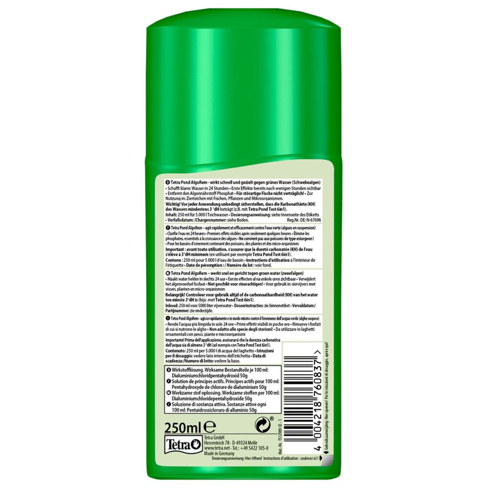 Застосування та дозування: добре збовтайте перед використанням. Додавайте 50 мл засобу Tetra Pond AlgoRem на кожні 1000 літрів води, використовуючи ковпачок-дозатор. Для максимального результату рівномірно розподіліть засіб. Перед кожним використанням переконайтеся, що карбонатна жорсткість (КН) води становить щонайменше 6°dH.
