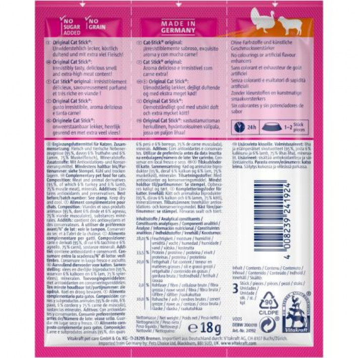 М’ясні палички Vitakraft Cat Stick + Truthahn & Lamm з індичкою та бараниною полонять серце вашого котика. Вони містять багато м'яса, мають спокусливий запах і просто неперевершений смак. І без будь-яких штучних підсилювачів смаку.