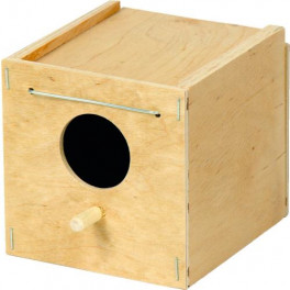 Будиночок для птахів виготовлений з фанери вищого сорту. Він надійно кріпиться із зовнішнього боку клітки, добре тримається і виглядає естетично. Матеріал не оброблявся токсичними речовинами - фарбами..