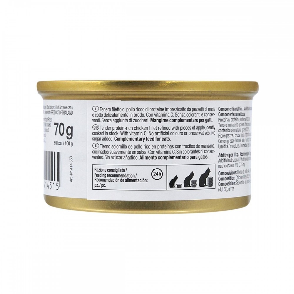 - Удобная консерва для кошек с курицей и яблоком обеспечивает сбалансированное содержание белков и витаминов.