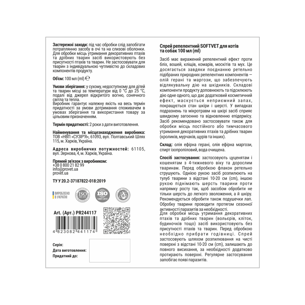 Спрей Provet SOFTVET репеллентный для котов и собак 100 мл