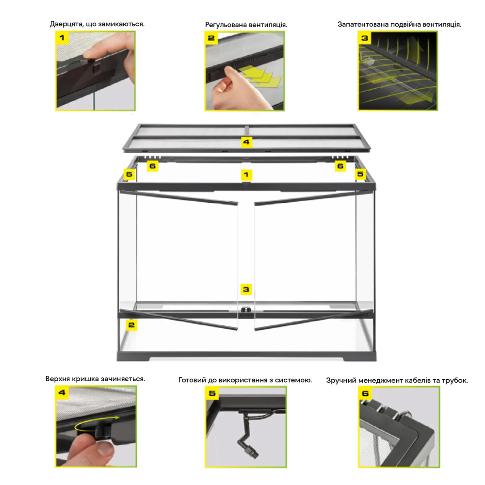 - Продуманная конструкция от бренда ExoTerra позволяет легко интегрировать дополнительное оборудование для террариума, такое как системы освещения или обогрева.