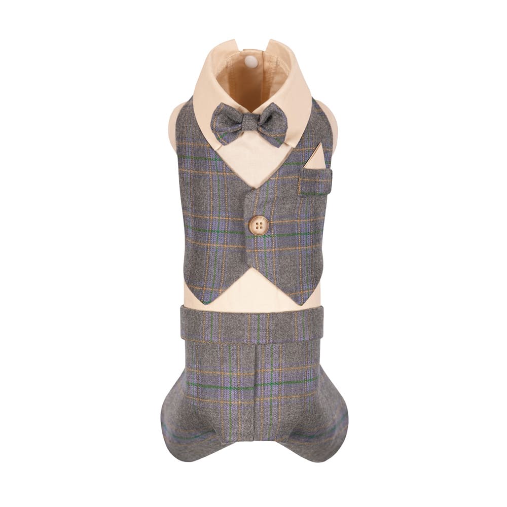 Костюм удобно надевать благодаря надежной застежке на кнопках. Рубашка из натуральной хлопчатобумажной ткани приятна к телу, материал не скользит и позволяет коже дышать. Штанишки, жилетка и стильный галстук-бабочка изготовлены из качественной клетчатой костюмной ткани. Это идеальная демисезонная одежда для собак, сочетающая комфорт и эстетику.